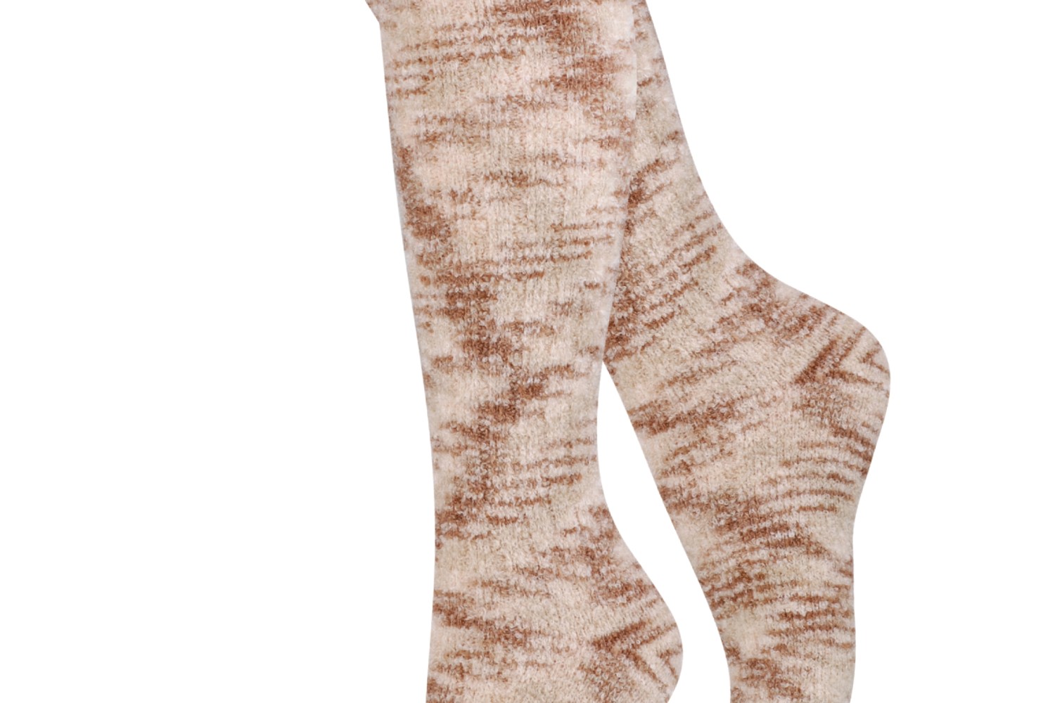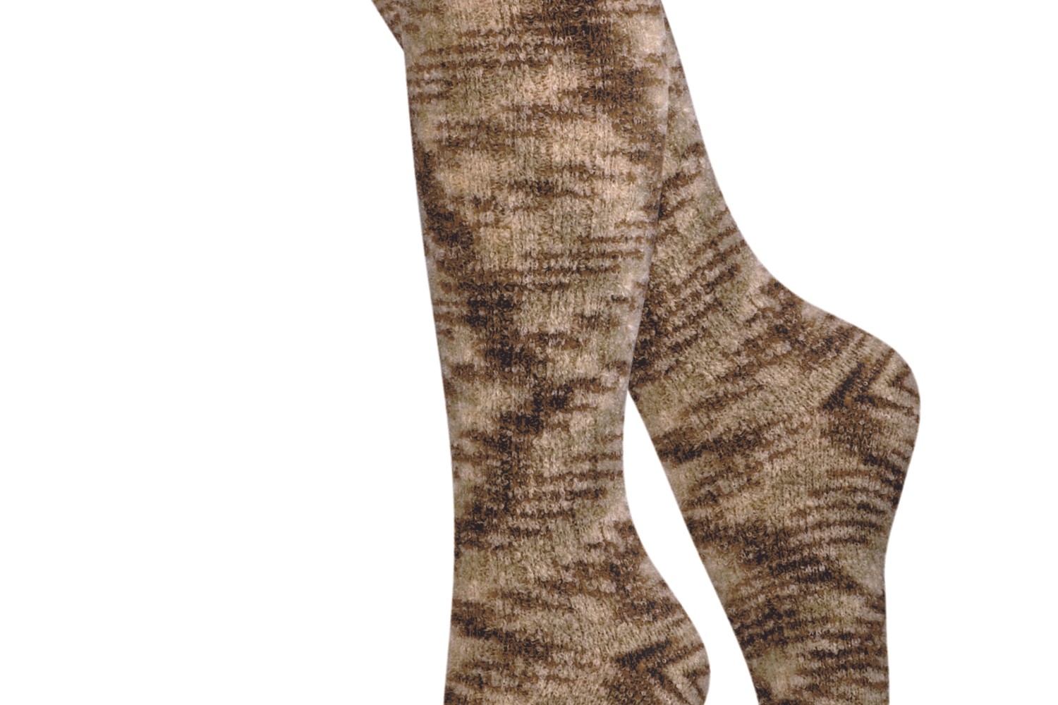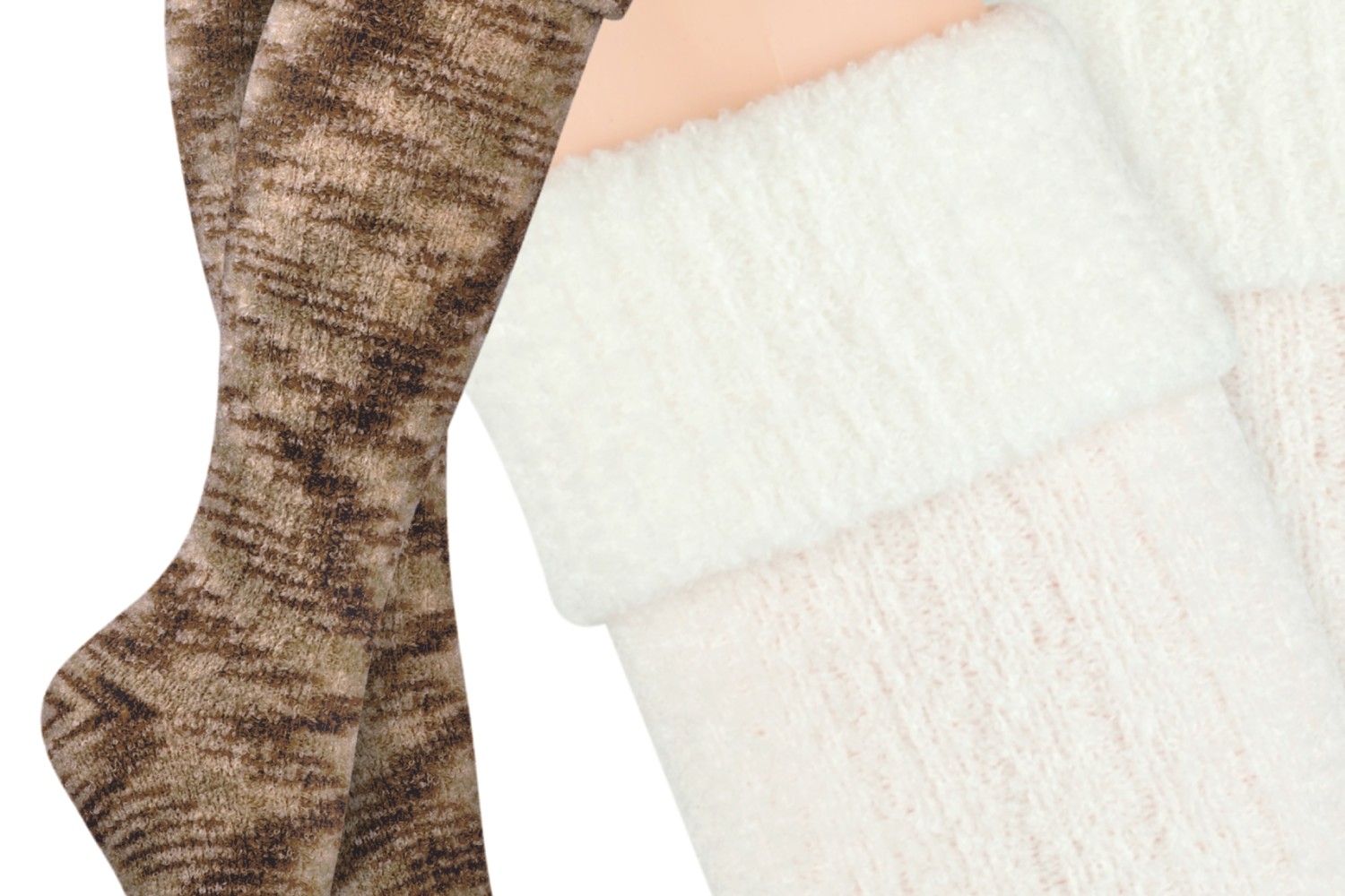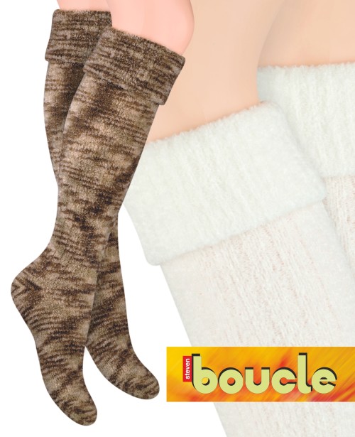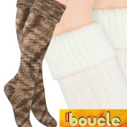 Bouclé knee socks with a turned down cuffs for women. Produced in solid and shaded colours. Warm and soft, ideal for cool days. Perfect element for women and junior fashion.