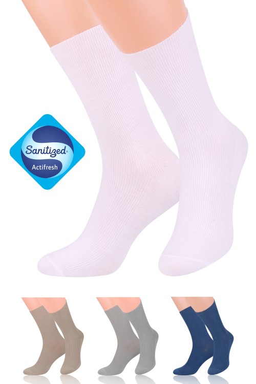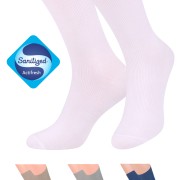 Heilsubætandi sokkar með víðu stroffi og þráðum með sótthreinsandi eiginleika. Fínlegir og mjúkir, úr bestu fáanlegu bómull. Tilvaldir fyrir þá sem glíma við blóðflæðivandamál eða bólgur. ,,Sótthreinsi-þræðirnir” draga úr bakteríu- og sveppamyndun og eyða ólykt. Sokkarnir halda eiginleikum sínum í að minnsta kosti 20 þvotta. Fást í nokkrum litum. – FRÁBÆRT VERÐ!